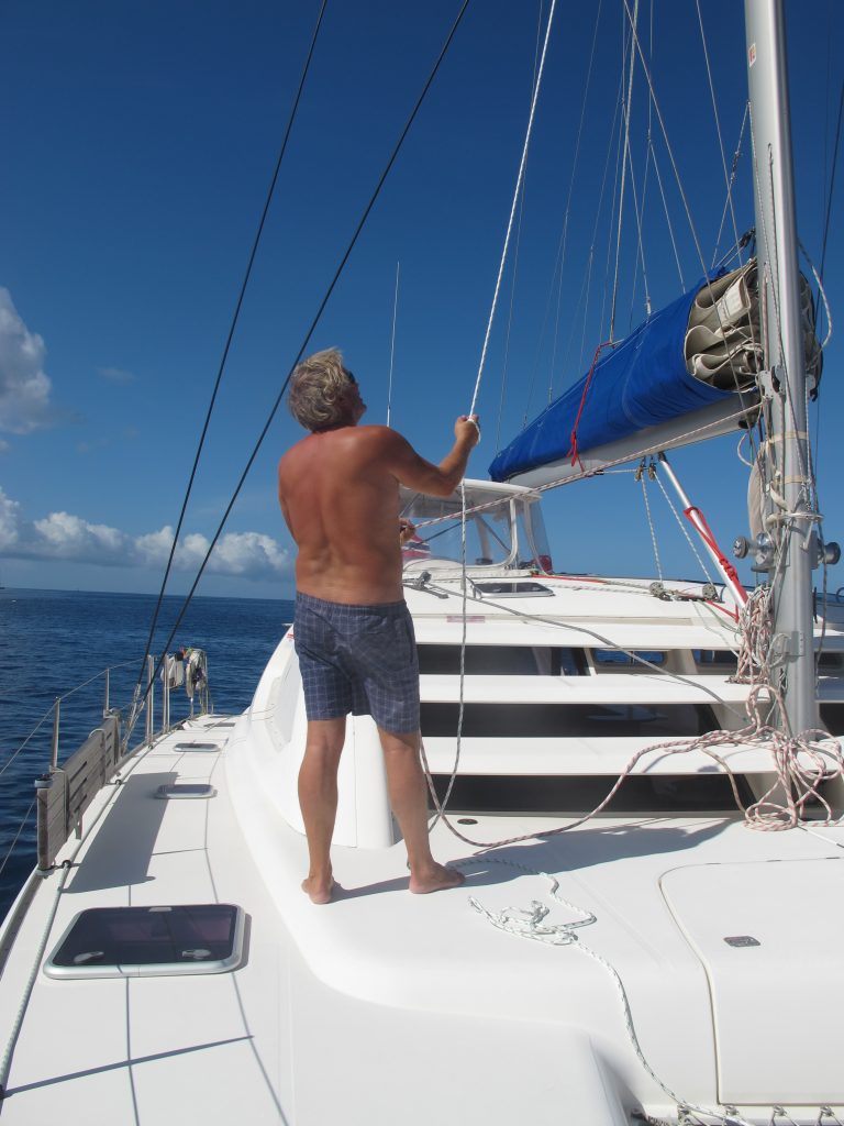 Men allerede klokka 08 heiste vi ankeret og satte kursen for St. Pierre på Martinique. Skvalpete, men flott vind. Som det var fint å seile på. Hvis bare sjakkelen på genoafallet hadde holdt seg på plass. Et par timer ut på turen hadde den skrudd seg ut, og genoaen virket ikke lenger. Heldigvis var den rullet inn, og Steinar merket det da han skulle rulle den ut. Da slapp vi å ha den i en kladeis i trampolinen.