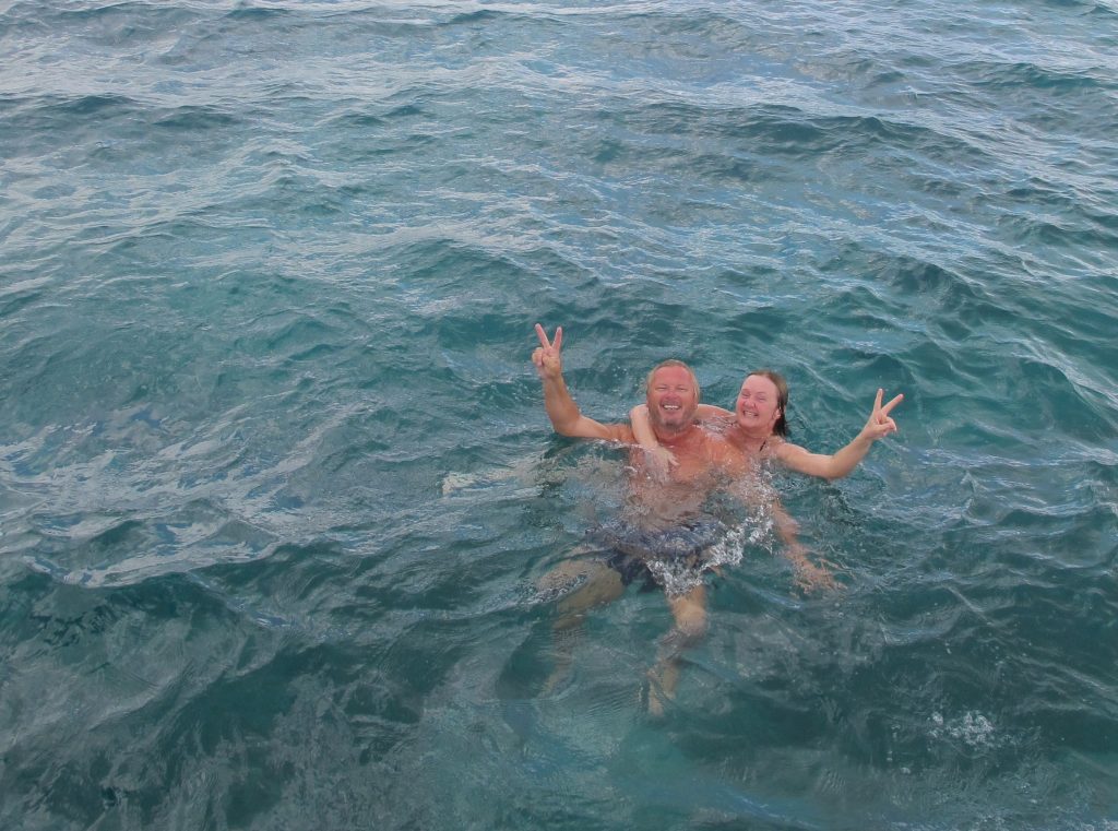 Selv om Terje lurte på om det var hai i vannet, så hoppet han uti etter hvert han også. Vannet er jo helt fantastisk deilig, og det er luften også. Første dagen var det litt mye skyer. Det var sol, skyer, sol, skyer osv. osv. Først var gjestene våre litt irritert på disse skyene, etter hvert var de takknemlige. Det er nemlig veldig varmt.