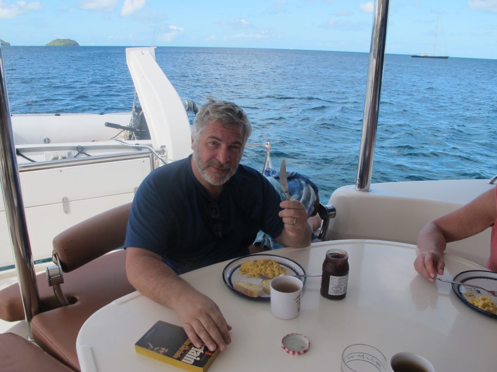 Dagen derpå var det regnevær. Men det var kanskje ikke så dumt, for alle og enhver er litt solbrente. Inger og Steinar jollet til land og kjøpte egg, for Matthew ville lage fransk omelett til oss til frokost. Det får han selvfølgelig lov til. Og det smakte fantastisk.
