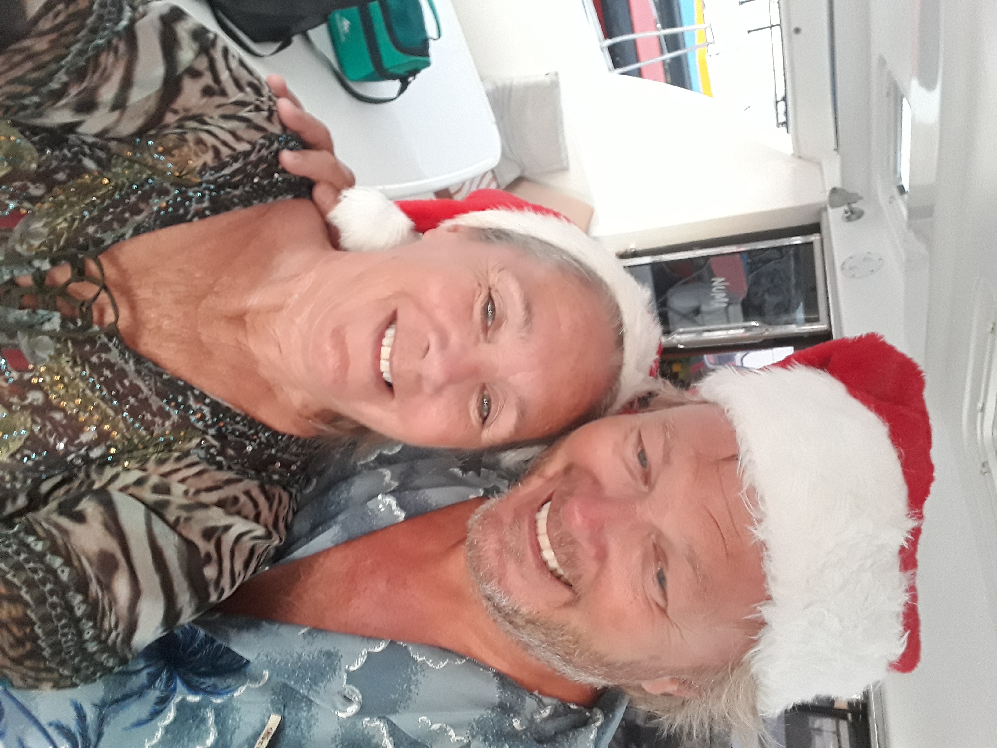 Vi har pyntet oss til julefest med de andre seilerne her i marinaen. Tror ikke noen av de andre har barna sine her heller.Julepresang ble det også. Veldig kjekt å ha, det er jeg helt sikker på. Flotte antenner og det hele. Hadde egentlig ønsket meg nye fendere, men det ble vel for dyrt. Dessuten er det vanskelig å bli kvitt de gamle. Fyller jo opp søppelkassene i en mils omkrets.Julaftenkalaset er et spleiselag. Alle tar med noe å spise. Vi lager horse d’ovre eller hva det heter. Omelett med spansk skinke. Godt. Og selvfølgelig måtte jeg få på meg noe mer behagelig når jeg skulle lage mat. Godt habitten ikke datt ned i maten.