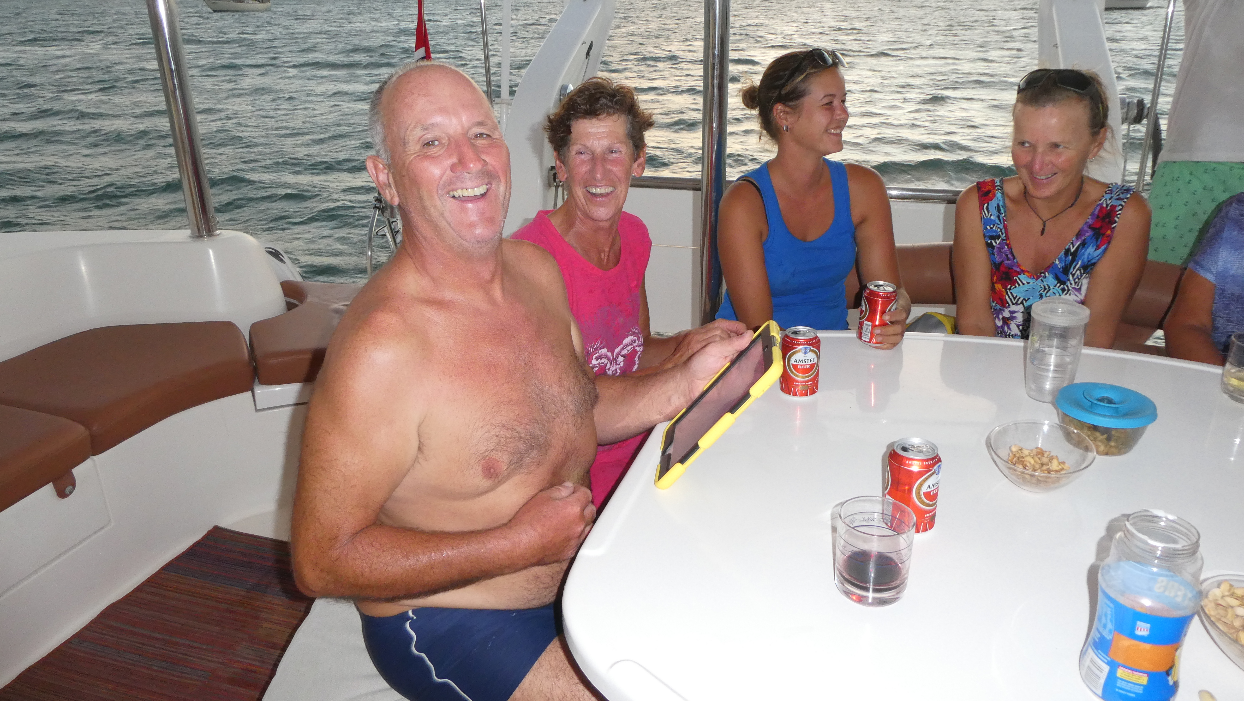 «Suzie Too» har fortsatt ikke reist videre og Suzanne har inviter Gruppe 2 om bord til dem for et informasjonsmøte.Vi møtte selvfølgelig opp mannsterke.Det skal sies at vi var ganske lei etter en liten stund. Suzanne og mannen hennes David har mye de skal ha sagt. I munnen på hverandre. De overleverte massevis av informasjon som sikkert er relevant. Informasjon som vi i Gruppe 2 ikke satte så veldig pris på, var at Suzanne synes det er skikkelig slitsomt å ha to grupper. Det skulle de ALDRI gjøre noe mer. Og takk for det. Etter et par timer var det endelig ferdig og vi kunne dra tilbake til «Numa».Og gjøre dette. For første gang på så lenge jeg kan huske var det endelig tid for en deilig svømmetur i krystallklart vann. Vel, hvis vi ser bort fra det grisekalde badet i Santa Marta ?Etter en liten stund kom Jeff og Julie fra «J Squared» svømmende. Julie driver visst og trimmer Jeff. Men de kom ikke lenger enn til oss. Her kom de om bord og fikk et glass vann og litt pomelo. Merkelig folk, de ville ikke ha en iskald pils. De er, som alle vi møter, veldig hyggelige folk. I kategorien amerikanere som prater høyt og mye. Morsomme og underholdende.På ettermiddagen hadde «Suzie Too» invitert til sundowner på Bora-Bora. En resort i bukta ved siden av der hvor vi er ankret opp.Det var jo litt merkelig å bli møtte av massevis av ansatte som jublet, klappet og ønsket oss velkommen. De hjelp oss i land og geleidet oss opp til fasilitetene.Og dette her var jo enda merkeligere. Hvert «bord» var en SENG. Med laken og puter og det hele. Vi kunne til og med trekke for gardinene. Hvis vi skulle gjøre «private» ting tenkte jeg. Så alle måtte velge seg en seng så kelnerne visste hva de skulle sette på regningen. Merkelig.Det føltes veldig rart å skulle sitte to stykker i hver seng og se på solnedgangen. Og enda merkeligere hvis jeg skulle krype til køys med f.eks. Rhonda og Tim 🙂Selv om utsikten var så å si perfekt.Det endte selvfølgelig med at vi seilere minglet rundt mellom sengene. Til kelnernes store fortvilelse. Da hadde de jo ikke noe «bord» å servere ved, og sette regningen på. Vi gikk til baren og kjøpte våre egne drinker, for vi husket jo ikke «bordnummeret» vårt.Kapteinen har vært og hentet pils selv.Dessverre er kameraet mitt av heller dårlig kvalitet, så kveldsbilder er vanskelig. Men flere av Gruppe 1 båtene er fortsatt her, så vi hadde en hyggelig kveld sammen med Fredrik på «Bushpoint» og hans svoger og svigerinne. Jeanette kunne ikke komme for hun har fått influensa. Godt å få praktisert svorsken igjen.