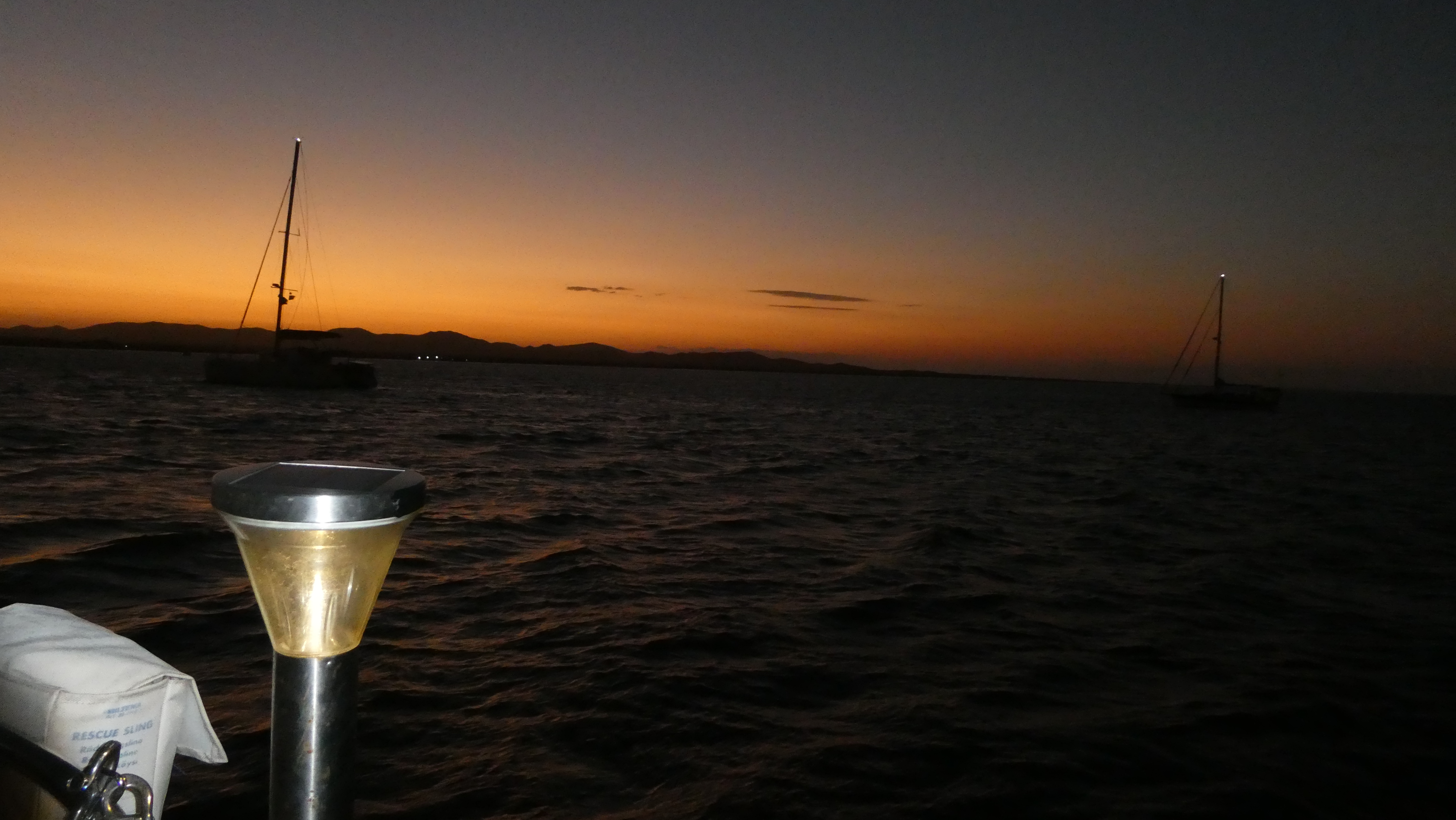 Selvfølgelig finner vi bestandig en løsning. Vi bandt alle jollene sammen og forankret oss i en begredelig brygge. Det er som sagt ikke å gå i land. En brygge er jo ikke på land.Dan og Lori på «Be-Be» på vei til møtestedet.Selvfølgelig hadde vi en kjempehyggelig sundowner. Den første i joller bundet sammen.Selvfølgelig klarte vi å drikke solen denne gangen også til en fantastisk solnedgang. Ikke noe grønt glimt da.Vi kosær vårs. Det er Jeff på «Canapasia» sin bursdag i dag. Vi sang bursdagssangen for han. Jeg tror ikke at noen av oss kan synge, for det hørtes helt skrekkelig ut. Og vakte masse latter så klart.En gang til – solnedgang. Det tok lang tid å drikke solen ned i dag