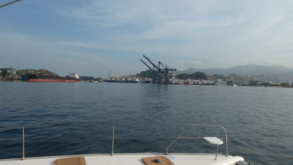 Innseilingen til Santa Marta tidlig på morgenen.Det ser ut til å være en stor by. Her blir det spennende å utforske.Vi har lest at det er et kullverk i byen. Her blir kullet knust og skipet ut. Og legger også fra seg et fint belegg av sot på alt og alle.Det er en stor og travel havn. Digre båter går inn og ut hele dagen, og noen ligger til ankers i havnebassenget rett på utsiden av marinaen.Klokka 8:30 hadde vi funnet innseilingen til marinaen og ut kom en jolle og hentet oss. Vi fikk beskjed om å feste fendere og tau på babord side og så geleidet han oss inn til plassen vår.Det gikk som smurt for der stod Julio og Umberto klare til å hjelpe oss med fortøyningene. Snakk om service. Så da er «Numa» atter en gang lenket fast i en brygge.Gutta sjekker inn.