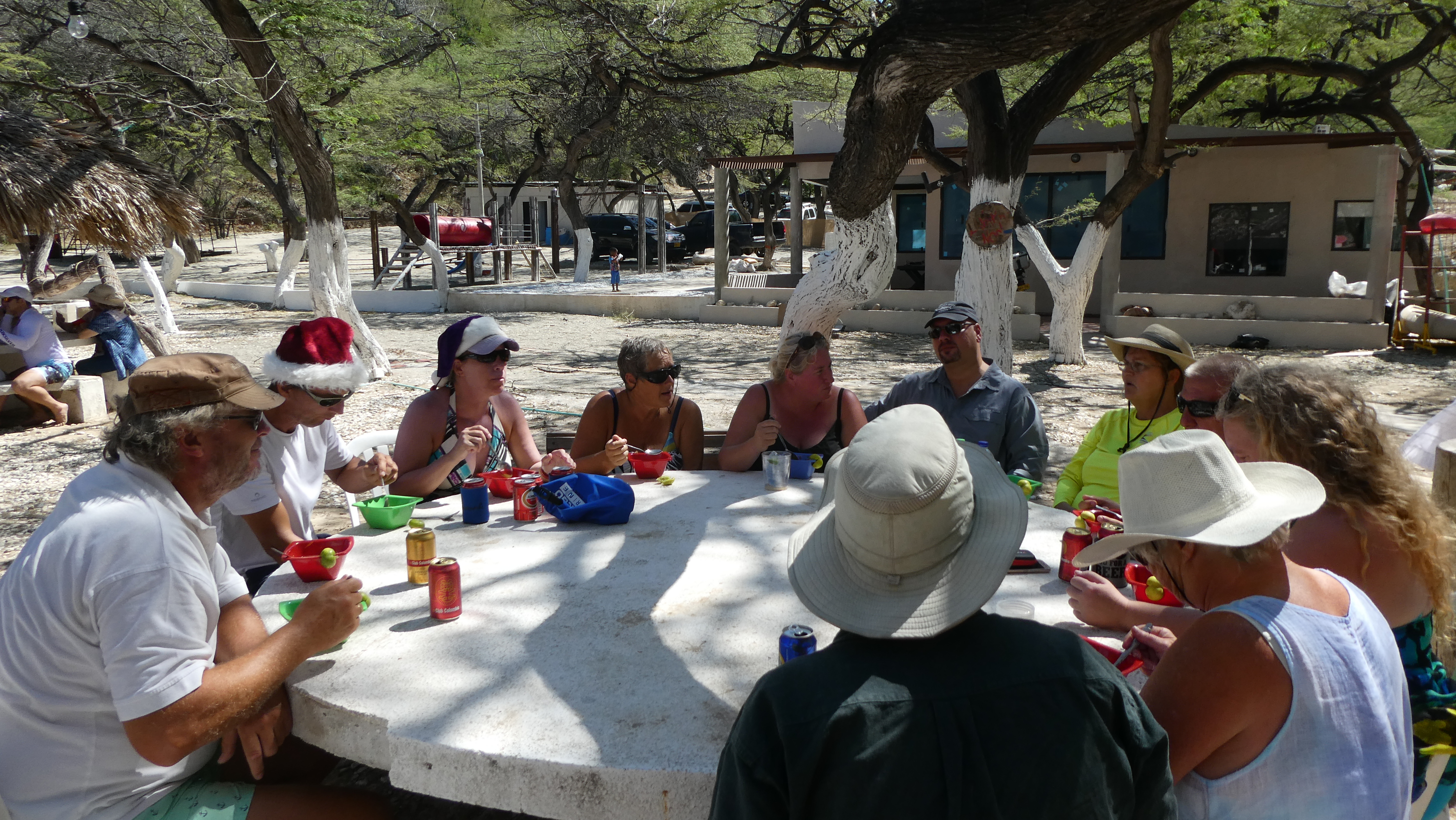 Etter maten samlet vi oss igjen i skyggen ved stranden. Flere av oss badet, og vannet var grisekaldt. Merkelig. Noen av de nye damene (som jeg ikke vet hva heter) hadde med seg nydelige kaker, men det gikk mest i drikke og snacks. Vi er jo seilere.