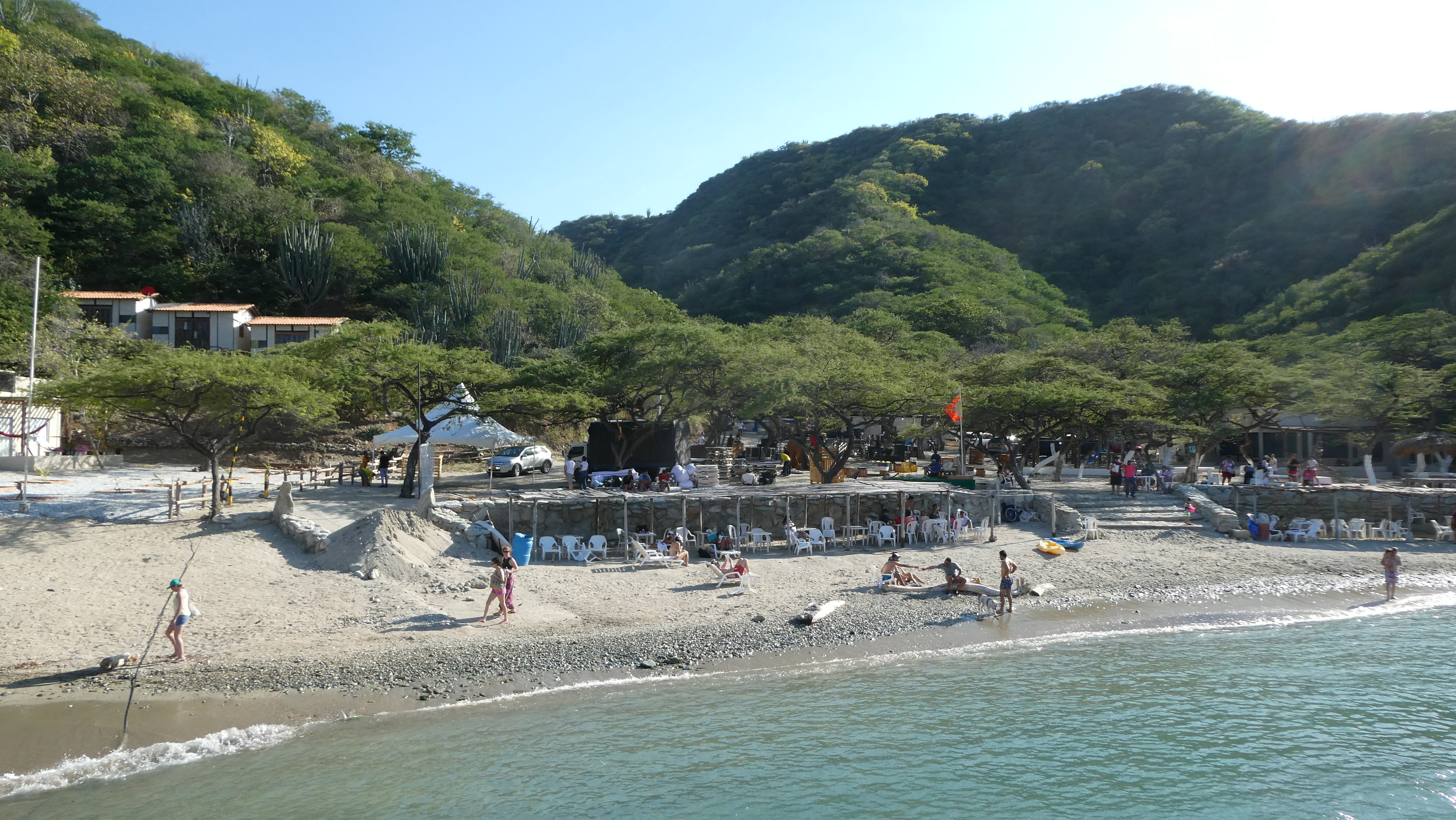 Ikke så veldig lekkert ytterst i marinaen. Moloen fanger opp søppelet som kommer fra land. Skulle ønske at marinaen kunne ta det opp.Vi er klare om bord i katamaranen «Tayrona» helt presis klokka 10:20. Litt tidlig for enkelte.Turen gikk til Tayrona Nasjonalpark, og vi fikk se mange unike steder. Dessverre kom all informasjonen på spansk og vi skjønte ikke stort. Selv med 3-4 timer spanskkurs på baken.Hva med en hytte ved sjøen? Ikke skjønner jeg hvordan folk kommer seg hverken opp dit fra sjøen eller ned fra fjellet. Båtturen tok oss med på innsiden av klippene vi så desperat ville unngå da vi seilte inn til Santa Marta. Det var mye småøyer, klipper og rev som vi helst ville unngå ja.Nye hytter bygges også i fjellsiden. Det er nok en fantastisk utsikt over havet. Hvordan man skal komme seg opp, eventuelt ned til disse hyttene er et mysterium. Kanskje de skal lage heiser 🙂Dette er stranden El Rodadero. Dit valfarter colombianerne i helgene. Heldigvis skulle vi ikke dit.Men hit skulle vi. En stille og fredelig strand inne i nasjonalparken.Det var et spetakkel å få lagt til. Vet ikke helt hva jeg skal si om tilstanden til denne brygga. Gebrekkelig kanskje?? Men gutta greide det.Langs hele stranden er det slike bord og stoler under overbygg som gir skygge. Aldeles herlig. Man kan velge om man vil være i solen eller i skyggen. Her klumpet vi oss sammen rundt ett bord. Alle vi fra Suzie Too Rallyet.Vi fikk også lunsj. Først en fiskesuppe og deretter hovedrett. Fisk, kylling eller kjøtt ettersom hva du hadde bestilt.Kyllingretten. Den var veldig godt krydret. Smakte kjempegodt, men var vel ikke det mest fargerike jeg har sett.Vi gaflet i oss maten med stor appetitt.
