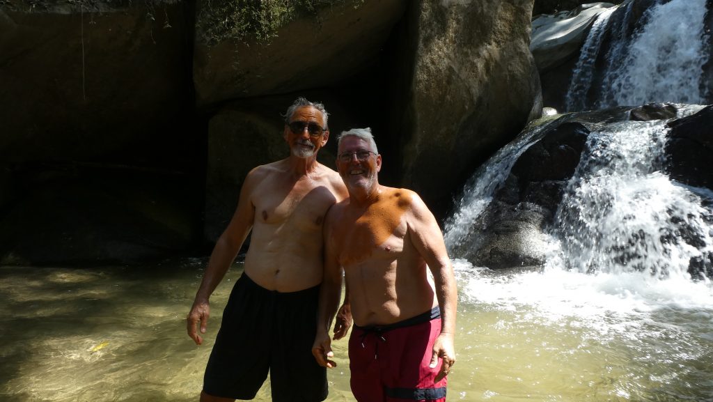 Før jeg fikk sukk for meg var den trivelige tiden i vannet over, og vi måtte ut å klatre igjen. Jeg hadde spurt om det var enda mer klatring og fått et klart nei til det. Snakk om løgnfull guide. Men først måtte jeg jo drite meg ut litt. Jeg tok på meg sokker og sko, og så viste det seg at vi måtte vasse i elva. Før vi måtte klatre opp en vanvittig bratt sti. Jeg blåste i skoene og vasset uti med dem på. Det fikk gå som det går. Michael viste seg å bli min store redningsmann. Lårmusklene mine ville ikke samarbeide mer, og jeg tror ikke jeg hadde kommet opp åssiden hvis han ikke hadde tatt meg i hånden og halvveis dratt meg opp. Jeg var så takknemlig at jeg kunne ha grått. Kathy, kona hans, forteller at han er en mester i å se når folk har det vanskelig og da gjør han alt for å hjelpe. Steinar hadde det litt vanskelig med sin egen kondisjon, men langtfra så ille som jeg.