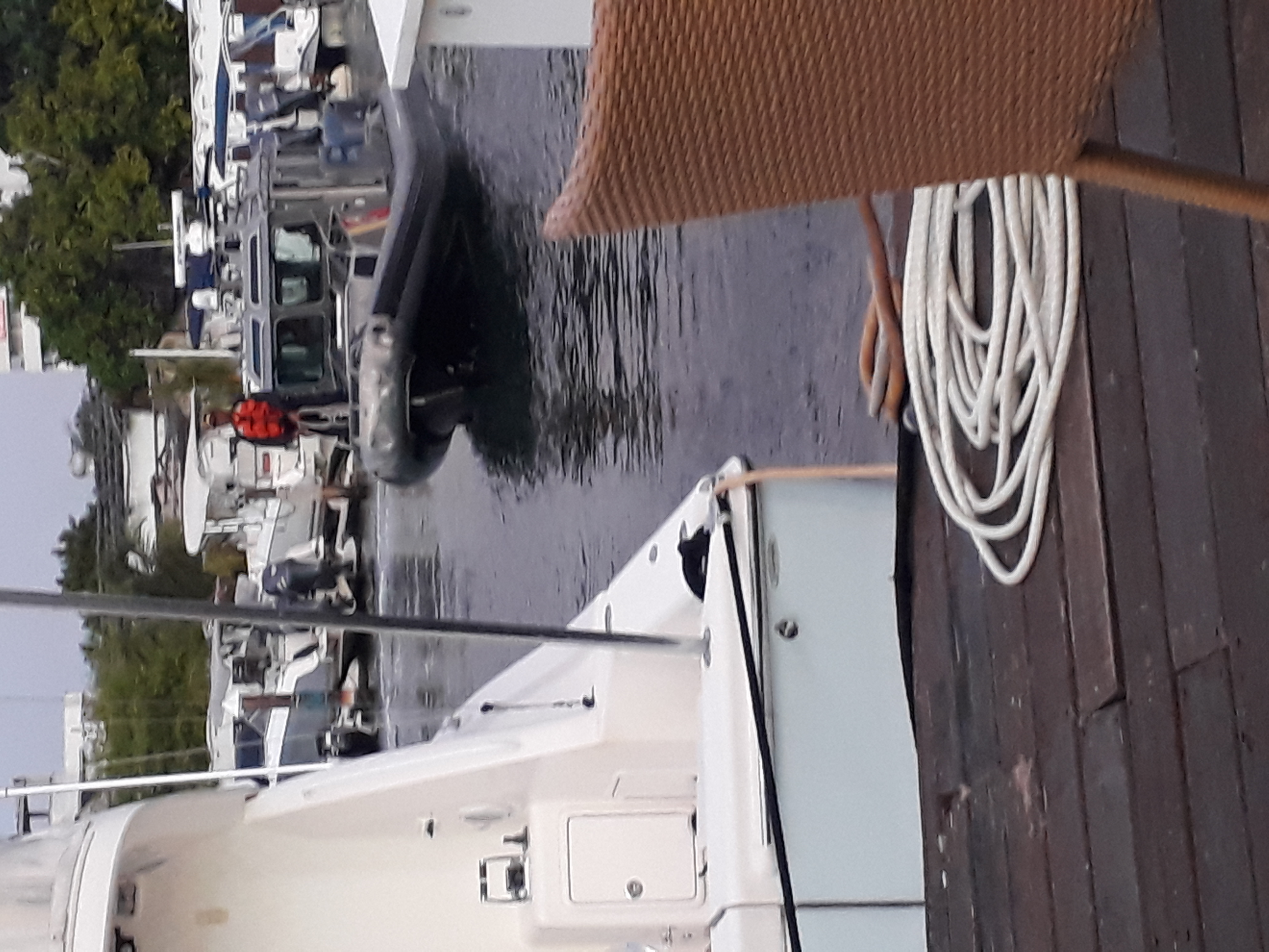 Dette er litt av elementet til flytebrygga. Den kunne ha kræsjet inn i mange båter på sin ferd innover i marinaen hvis ikke Leo hadde stoppet den.Og blodet litt Leo er splættet utover store deler av brygga. Stakkars mann. Heldigvis ble han godt tatt i mot på sykehuset og fingeren ble lappet sammen igjen. Så får fremtiden vise om han får en negl igjen og full førlighet i fingeren.