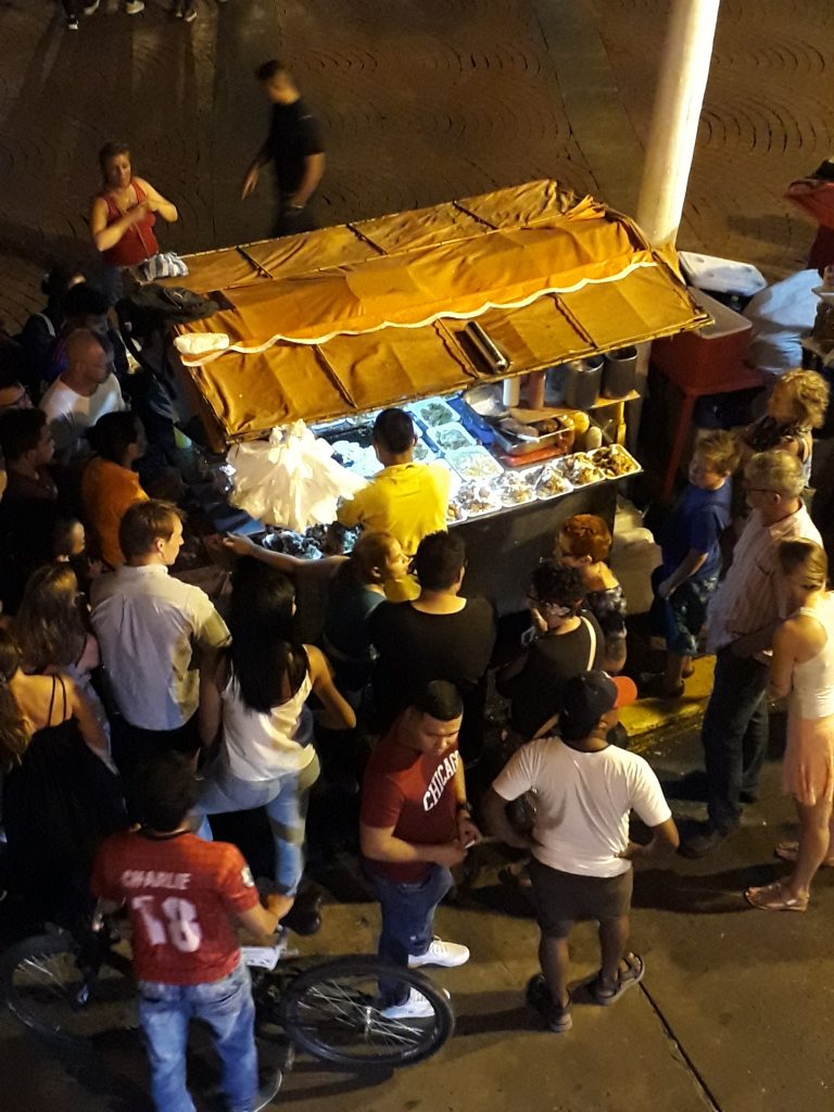 Vi er jo i Cartagena for å oppleve byen, så den andre kvelden ruslet vi over broa og inn i gamlebyen. Til Hostel området. Vi fant en sjarmerende liten uterestaurant på Plaza de la Santisima Trinidad. Dette er stedet der folk møtes.