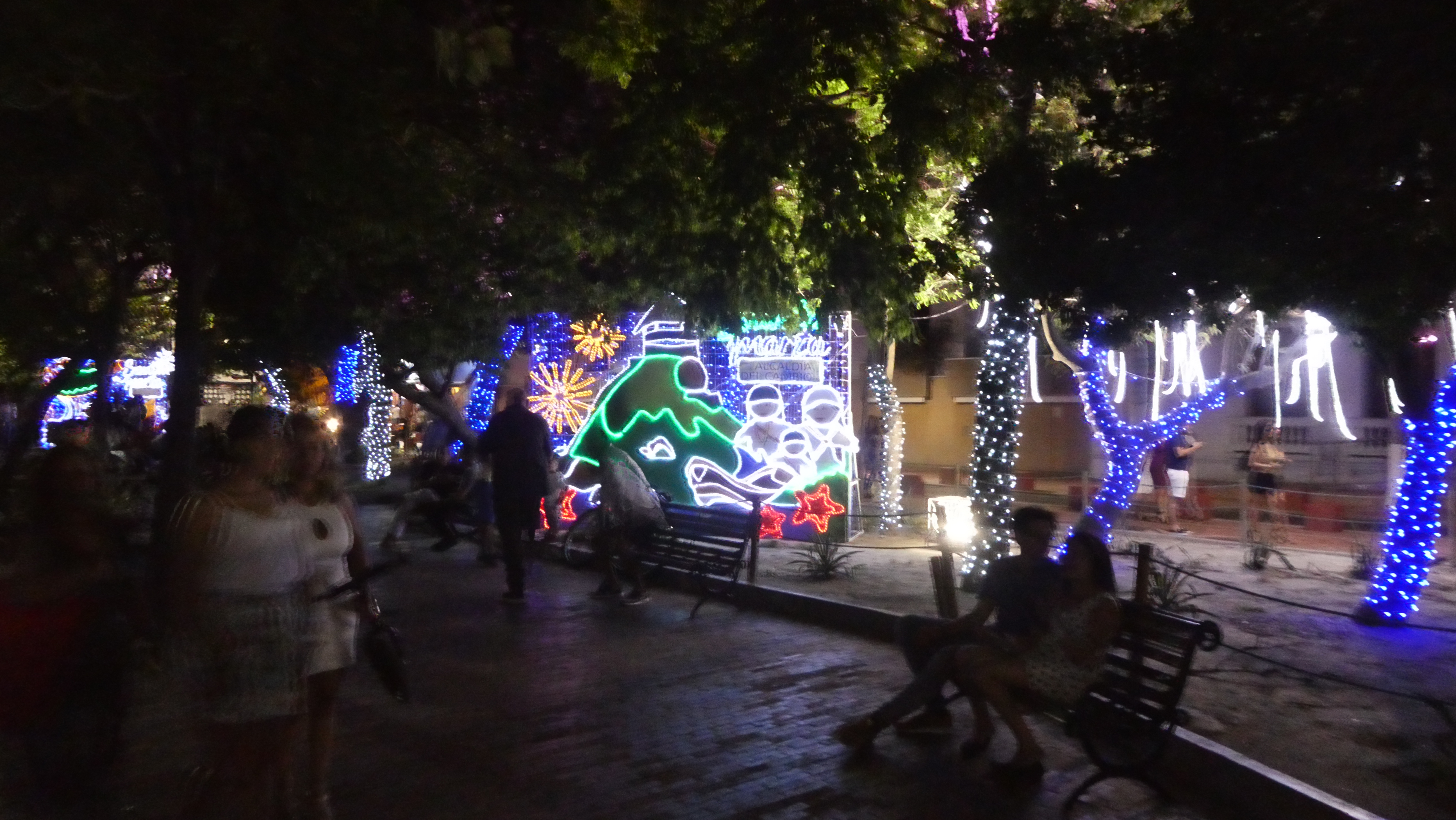 Torget og katedralen er fortsatt julepyntet.Jeg tror aldri jeg har sett en flottere seilbåt enn dette. Den må være laget av tusenvis av lys.Det er fullt på alle bordene og det er mange fortausrestauranter i området.Vi tar oss en skål mens vi venter på maten.Hva skal man si…….Det er mat. Steinar fikk en pizza som smakte veldig godt. Jeg fikk en lasagna som ikke smakte fullt så godt. Men det blir oppveid av den fantastiske atmosfæren på plassen.Når vi går er det bare vårt bord som er ledig på Cafe la Trinidad. Vi kommer nok helt sikkert tilbake.Et typisk hus i gamlebyen. Fantastisk vakkert. Og det skulle vi lære mer om senere.På vei tilbake til marinaen tok vi strandpromenaden, og der fant vi enda en Food Court. Med masse mennesker. Vi satte oss ned og tok en pils og en pust i bakken.Det er flott i denne parken som Food Courten er.På vei tilbake over broa. Massevis av julelys fortsatt.