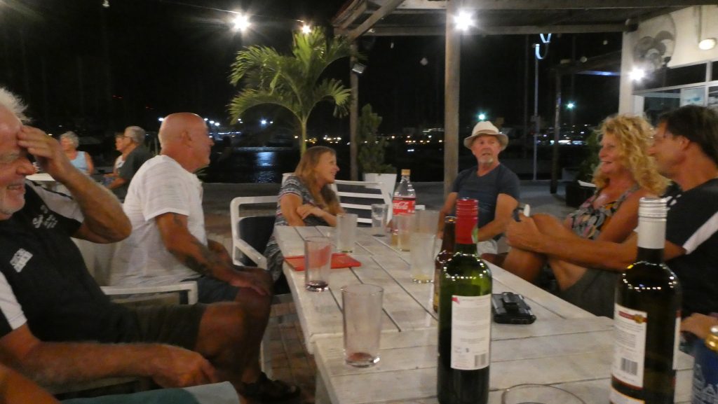Gruppe 1 hadde også kastet anker her. Siden vi ikke har sjekket inn i landet er det ikke tillatt å gå i land selvfølgelig. Det hadde flere i gruppe 1 gjort, og lagt det ut på Facebook. Suzanne (den store lederen vår) hadde ikke vært blid. Så vi er flinke og går ikke i land. Vi kunne selvfølgelig ha spurt kystvakta om vi kunne, men……vi inviterte til sundowner i «Numa» isteden.