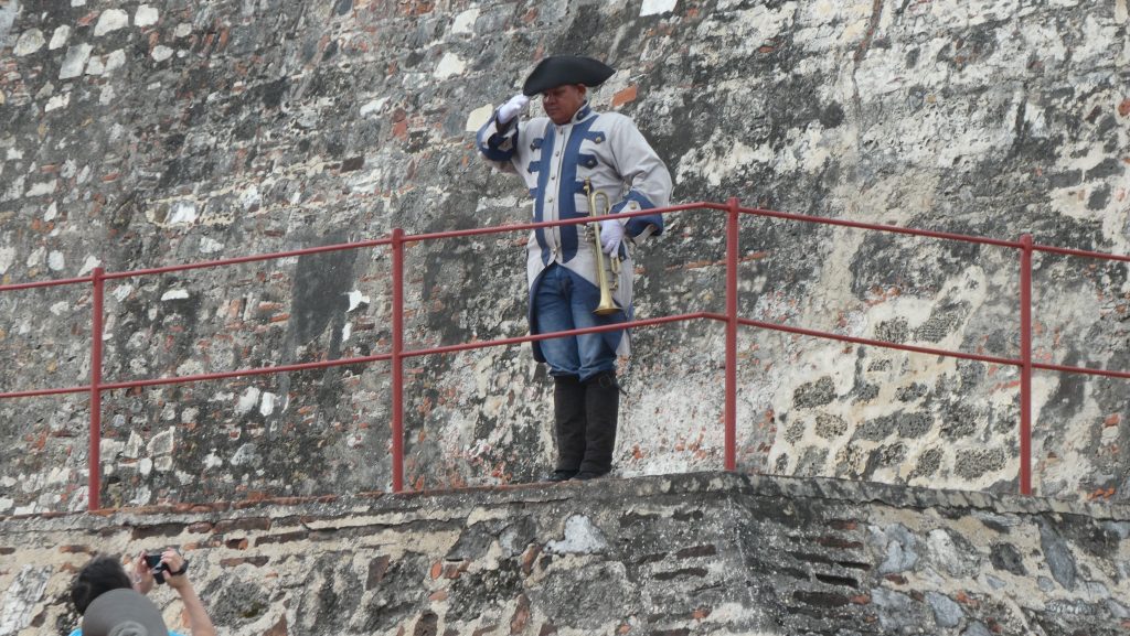 Omtrent 20 av oss møtte spent opp på kaia til en guidet tur.Guiden vår het Sam (egentlig noe helt annet på spansk som vi ikke forstod). Det viste seg at han var både kunnskapsrik og morsom. Både faren og bestefaren hans hadde vært guider i Cartagena. Han fortalte oss massevis av historier på vår busstur gjennom byen.Første stoppested var Fortress of San Felipe. Det er bygget av italienske ingeniører. Både fortet og muren rundt byen. Det er mange som har forsøkt å ta Cartagena fra spanjolene. USA, Nederland, England og Frankrike.Vi hadde flere stopp på veien opp til toppen av fortet. Sam fortalte villig vekk. Særlig om engelskmennene under admiral Vernon. De led et grusomt nederlag og Cartagena har aldri senere blitt forsøkt erobret. Da engelskmennene ikke klarte å ta Cartagena sjøveien, prøvde de over land. Rundt Cartagena i 1741 var det sumpland, bebodd av millioner på millioner av malariamygg.Admiral Vernon hadde 24 tusen mann til disposisjon. Cartagena hadde 6.000 inkludert slaver og indianere. Tusenvis av engelske soldater døde av malaria og dysenteri, så man må jo si at naturen hjalp Cartagenas store helt, Don Blas de Lenzo, til seier. Dette fortet er et imponerende byggverk og ingeniørkunst.Det er massevis av slike tuneller på kryss og tvers i borgen. Litt klaustrofobisk kan man si. De hadde også blindveier for å villede fienden.Heldigvis lå det ingen soldater og ventet på disse turistene. Tom, Di, Chris og Carol kom alle velberget ut av en av tunnelene.Vi ble selvfølgelig hilst av soldater kledd tidsriktig. Med reveljer og det hele.Øverst opp var det vakthus. Denne kjekkasen fikk nesten ikke plass. Tror nok spanske soldater for 3-400 år siden var ganske mye mindre enn vikinger fra 2019.