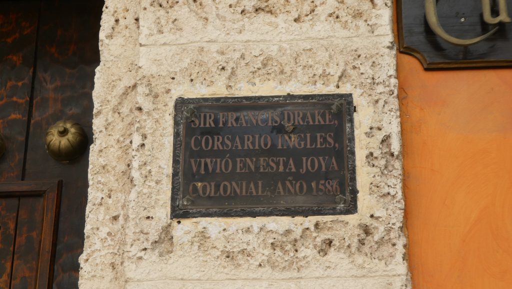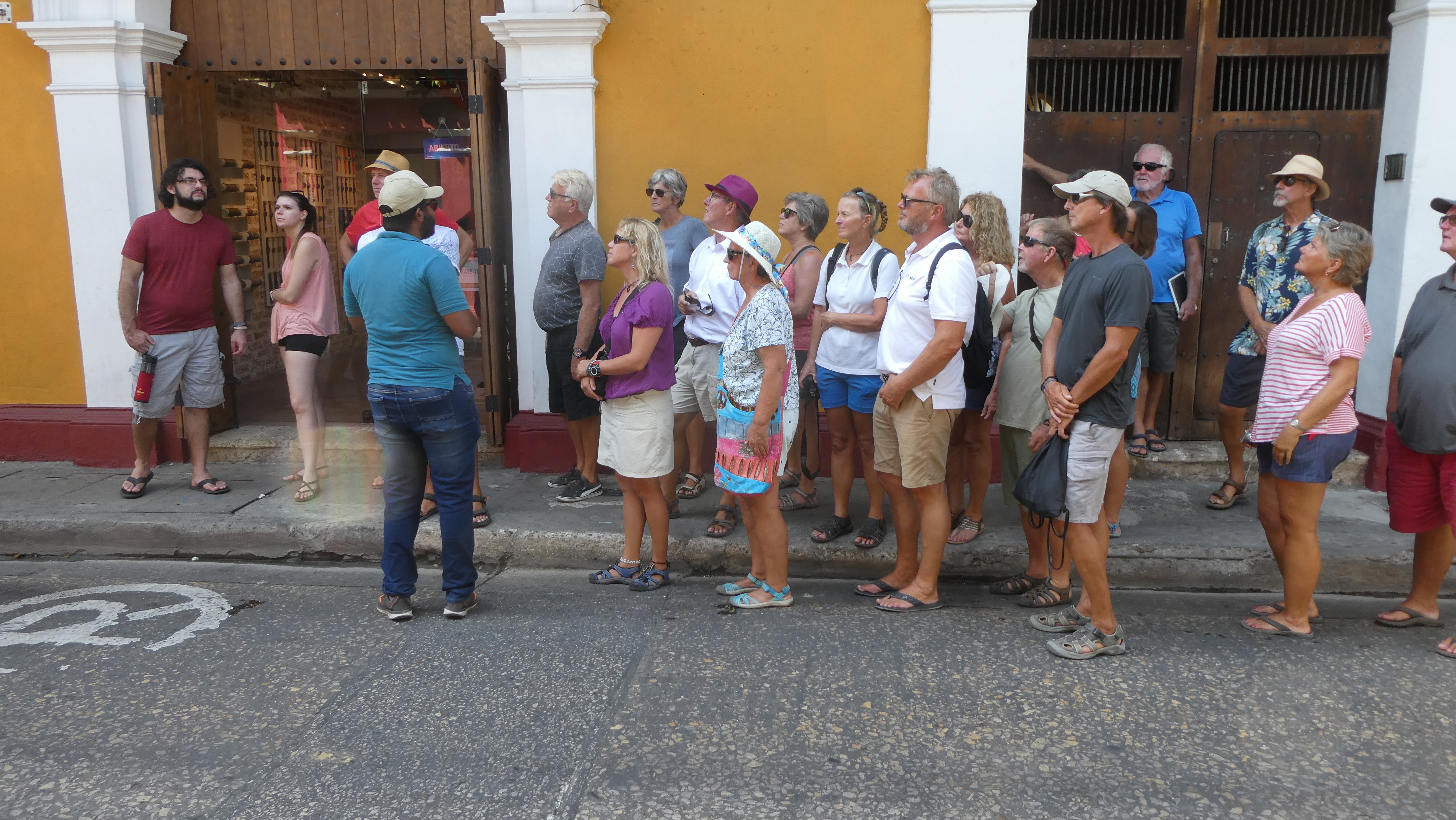 Etter at vi hadde vært i Sams butikk og betalt for turen dro vi til gamlebyen. Der ruslet vi fra den ene enden til den andre og fikk høre enda mer om byen. Vi startet ved huset til Gabriel Garcia Marquez som fikk Nobel prisen i litteratur, og avsluttet ved katedralen.Det er vakkert i gamlebyen. Vi fikk lære masse om gamledager. F.eks. var det slik at rikdom og sosial status ikke hang sammen. Hvis du var spanjol behøvde du nødvendigvis ikke å være rik, men du hadde aller høyeste sosial status. Hvis du var sønn/datter av spanjoler, men født i koloniene, så hadde du ikke så høy status. Hvis du rett og slett var fra koloniene fikk du aldri gode stillinger, eller kunne gifte deg oppover i hierarkiet. Husene viste også om du var fattig eller rik. Det er lave hus, en etasje, som er de billigst. Mellomhus som har to etasjer og en balkong, og høye hus på to etasjer, en mellometasje, lang balkong og små balkonger under disse.Dørhammerene fortalte også om hva eieren av huset drev med. F.eks. en firfisle fortalte at eieren drev innen medisin (lege/apoteker), en ørn fortalte at eieren drev innen alkohol, og en fisk faktisk at eieren var fisker.Hva løvene på Sir Francis Drakes hus fortalte fikk jeg ikke med meg. Men jeg gjetter på maktpersoner.Her bodde faktisk Sir Francis Drake i 1586. Til engelskmennene i følget vårt sin store irritasjon ble han kalt pirat. Han er jo en stor helt i England. Men Sam, guiden vår, takket han også, selv om han brant ned byen hans før han dro. Da ble nemlig arbeidet med den store borgen påbegynt for å beskytte byen mot en slik hendelse igjen. Og det virket jo.Alle byer i Sør-Amerika har en Bolivar park. Han kjeppjaget spanjolene ut av Venezuela, Colombia og Peru. Faktisk så døde han i Santa Marta der vi akkurat har vært, og som også var den første byen som ble frigitt.Vi ser ut som skikkelige turister. Og det er vi jo også. Vi hørte godt etter hva Sam sa. Han pekte også ut gode restauranter og butikker for lær og kaffe. Colombia er kjent for sitt lær som er av veldig god kvalitet. Vi kjøpte ingenting for dessverre så mugner lær i båten.Etter avsluttet tur ble mange med bussen tilbake til marinaen. Steinar og jeg gikk på en heller glissent besøkt restaurant. Kjempedyr og ikke veldig god mat. Men vi ble mette.Fargerike hus på veien tilbake til marinaen. Fortsatt i gamlebyen.