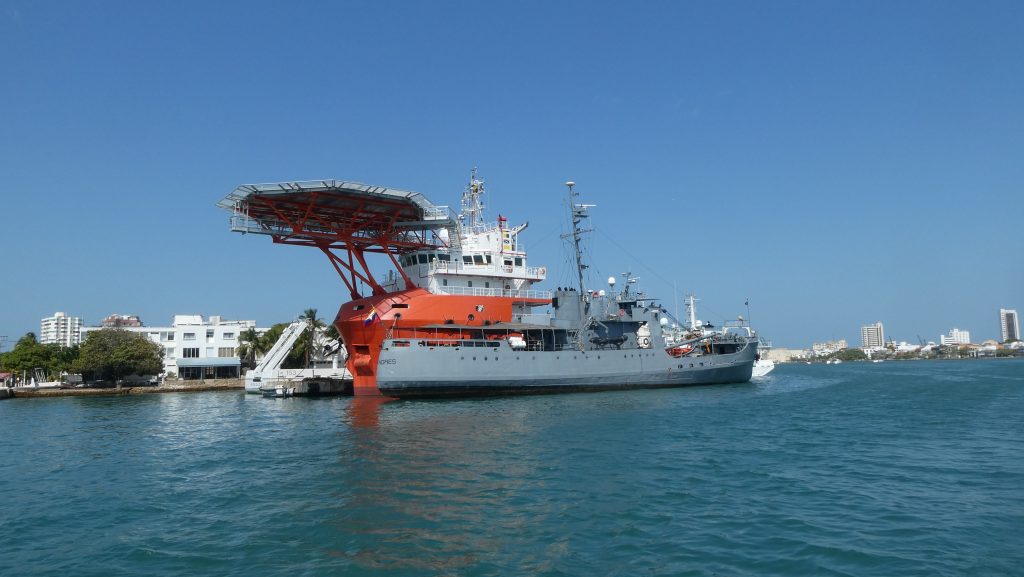 Så var siste dagen i Cartagena kommet. Kystvakta «Armada» hadde selvfølgelig fått beskjed om at vi alle skulle reise, så de kom bortom for å forsikre seg om at det var Islas del Rosario vi skulle til. Veldig hyggelige gutter.Men før vi la i vei måtte vi ha diesel. Det er ikke mye vind i disse farvannene på denne tiden av året. Bare bølger. Det gikk veldig trått på begynnelsen, før vi skjønte at pumpa stoppet når vi hadde fylt for 10.000 Pesos. Noe sånt som 4 liter. Da måtte vi trykke på dieselpistolen for å få den til å fortsette.Imponerende marinefartøy dukket opp på vår vei ut av Cartagena. Eller kanskje det er forskningsfartøy.Et militært skip kom seilende mot Cartagena. Da de passerte oss ble det blåst i en fløyte, og alle om bord gjorde honnør til oss. Jeg syntes det var en flott gest, helt til noen fortalte meg at det gjør den colombianske marinen til alle fartøy som passerer dem på vei UT av en by. Vel, jeg velger å tro at det var spesielt til oss.