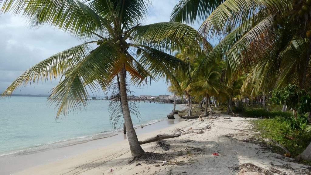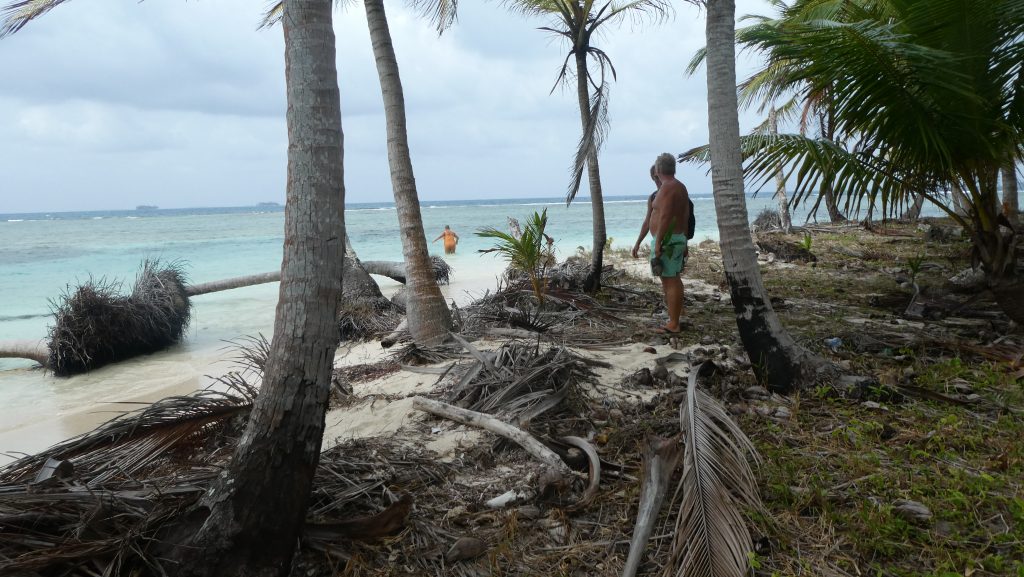 Morgenen etter våknet jeg til denne grisete, illeluktende gjesten. Den hadde klart å komme seg opp i cockpit og under en pute. Det er jo ikke engang en flyvefisk. Merkelig. Og jeg er helt sikker på at vi ikke fisket på vei hjem fra «Q4» i går kveld.Så var det på tide å utforske øyaDet tar jo ikke så lange tiden å gå rundt disse små øyene, men det er morsomt å seAdmiralinnen korrekt dandert oppetter et palmetre. På den vakre stranden et sted i karibien 🙂Denne palmen har nok sett sine siste dager. Alle palmene, alle kokosnøttene på alle øyene tilhører en eller annen guna. Det er strengt forbudt å ta med seg noen kokosnøtter til eget bruk.Underskogen blir holdt nede ved at den brennes. Også nederste del av stammene blir brent. Sikkert for å holde insektene unna. Denne øya er egentlig ubebodd, så denne hytta brukes nok sporadisk av fiskere og de som vedlikeholder palmeskogen.Det er litt trist å se alt søppelet som flyter i land. De har jo de samme problemene her som i resten av verden. Dritten skylles i land fra andre steder. Vi har sett at de forsøker å rydde opp og brenne søppelet, men det er vel vanskelig å kvitte seg med alt sammen.«Numita» ligger trygt forankret i en palmetre.Vi er selvfølgelig veldig slitne etter en slik oppdagelsestur. Godt vi hadde tatt med oss våre nye solstoler og en kald pils. Belønning på øverste nivå.