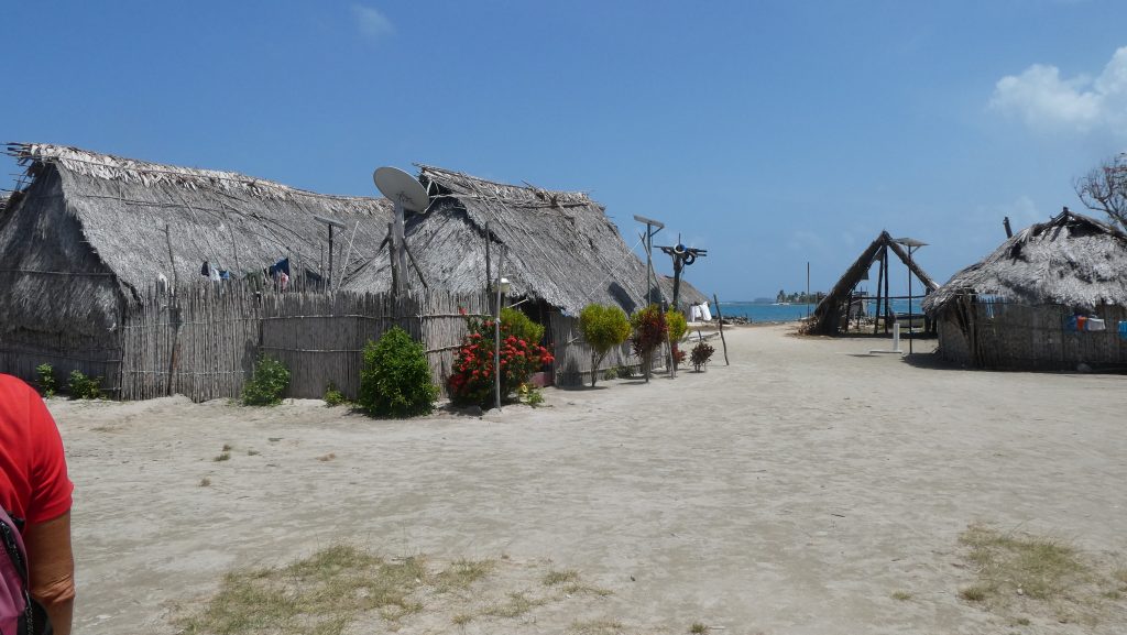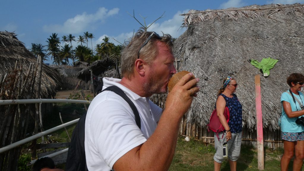 Dagen etter fikk vi somlet oss i land sammen med mange andre også. Det viser seg at det koster US$ 2,- pr.pers. å ha jolla på stranden. Nesten som en parkeringsavgift kan man si. Vi hadde jo hørt at det er sånn enkelte steder i San Blas, så vi betalte uten noen dikkedarer. Men det var enkelte som knurret skikkelig, kranglet og ville ikke betale. De tapte. De ga seg jo også når de ble fortalt at det var en engangsavgift. Vi må ikke betale hver gang vi skal ha jolla på stranden.Vi hadde også blitt fortalt at det ikke finnes restauranter eller serveringssteder i San Blas. Det første vi traff på var et serveringssted, så vi satte oss ned og tok en pils alle mann. US$ 2,- pr.stk. Alle skulle ta en runde på øya, og vi bestilte mat til klokka 17. De serverte kylling og ris til USD 8,- pr.pers.