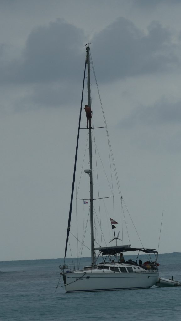 Jeff i «Canapesia» bytter lyspære i masta for oss. Det er gjengjeld for at Steinar heiste han opp i deres mast. Godt å kunne være til hjelp for hverandre. Hverken Steinar eller jeg synes det er spesielt festlig å klatre i masta.