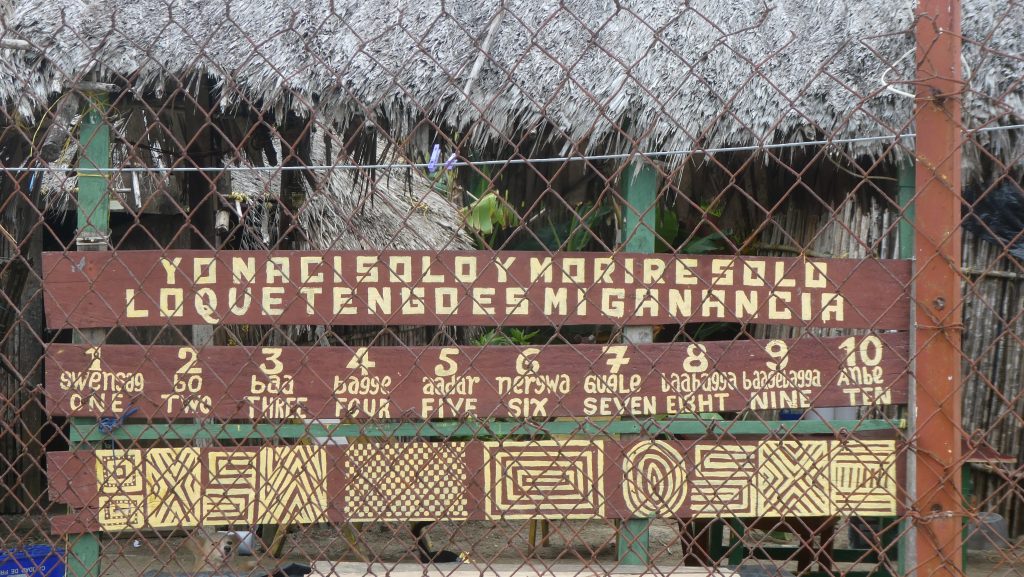 Dette er det offisielle Guna Yala flagget. Et spansk flagg med et hakekors i. Veldig spesielt, selv om jeg vet at hakekorset ikke ble oppfunnet av nazistene. Det har blitt brukt som ornament og religiøst symbol siden førhistorisk tid. Så vi får bære over med det.På byens torg er det et monument over Nele Kantule, gunaindianernes viktigste åndelige leder. Han er gravlagt på en liten øy rett utenfor Ustupu.Hovedgaten i denne byen er usannsynlig bred. Det er jo ingen biler her. Eller hest og kjerre for den saks skyld. Så folk har god plass. Her var det masse folk i gatene i motsetning til i landsbyen på Tupbak.Et nydelig lite husEn forlatt kirke. Det så ut som den hadde brent.En gribb godt plassert på korset gjorde det hele komplett. Skummelt.Sidegatene er mer å sammenligne med stier. Og det er et virvar av dem.Her kan vi lære å telle til ti på engelsk og guna. Jeg må innrømme at jeg holdt meg til engelsken.Midt i byen kom vi til et lite Venezia a la San Blas.Vi har aldri sett noe slikt som dette og selvfølgelig blir vi fasinert.Jeg er fornøyd for at jeg ble med inn til byen den andre dagen. Og jeg skal aldri aldri aldri mer være forutinntatt. Trur eg.Hele familien på tur? Her i Guna Yala er det kvinnene som tar hånd om økonomien. Det er et matriarkalsk samfunn. Mannen flytter inn til kvinnens familie når de gifter seg. Å bli skilt er visst en enkel affære. Kvinnen lemper mannens ting ut av huset. Og det er det. Mannen kan selvfølgelig også flytte hvis han ønsker det. Vi har skjønt at det er et åpent samfunn og alle legninger blir akseptert som noe naturlig.På kvelden hadde vi hørt at det skulle være en tilstelning med tradisjonell dans på torget. Så vi var ganske mange som tok turen inn. Det ville vi gjerne se.