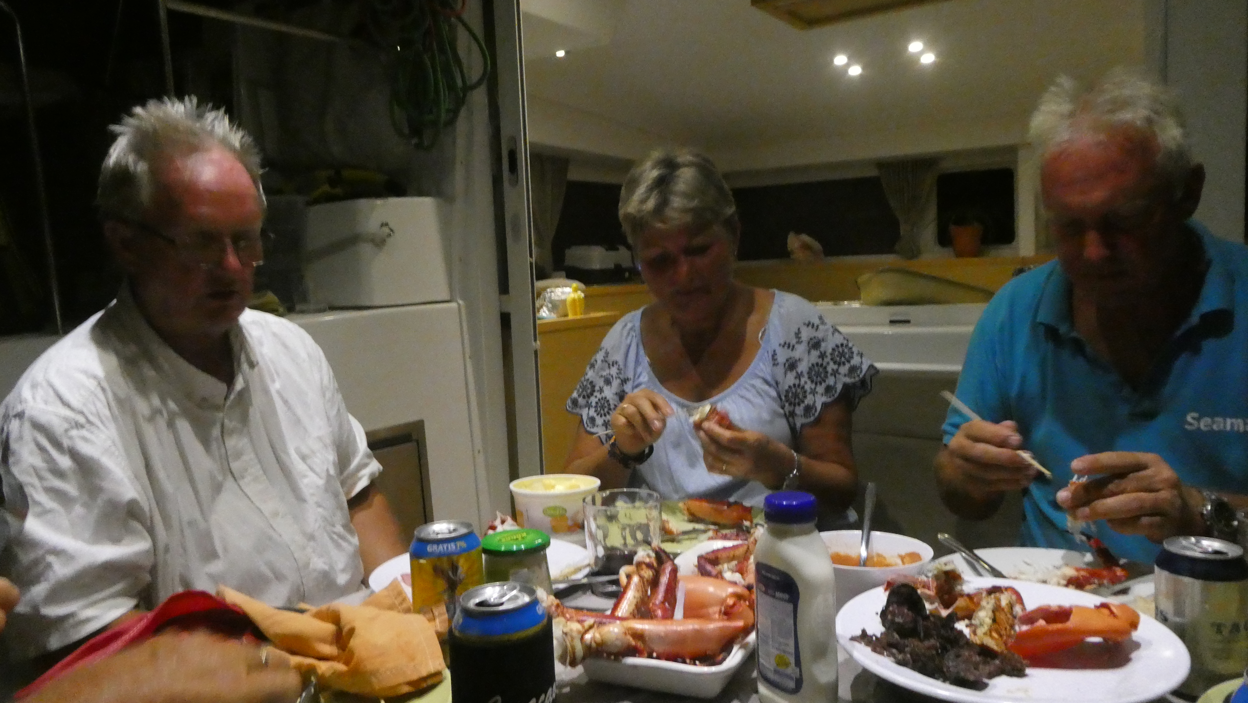 Ha det bra Ustupu. På utsiden er du stygg, men på innsiden er du vakker. Vi har også lært at alle disse skurene ute i sjøen er toaletter. Da er det ikke så rart kanskje at vi aldri ser barn som bader. Ikke voksne heller for den saks skyld.På Aridup ankret vi opp rett ved siden av «Wanderlust» og etter en liten stund kom en kano med 3 gunaer om bord. De solgte fisk, krabber og hummer.«Q4» fikk også besøk og så ut til å kjøpe noe.Så var det vår tur til å få besøk, og vi kjøpte faktisk en diger krabbe for USD 10,-. Den hadde ikke til hensikt å legge seg frivillig ned i bøtta. Da ungguttene spurte om vi hadde noe kaldt å drikke fikk de en pils hver og de padlet overlykkelige av gårde. De hadde nemlig fått pils av alle de andre også. Og vi som trodde gunaer ikke drakk alkohol.Rhonda og Tim på «Q4» inviterte på skalldyrfest, og vi tok med oss vår nå avdøde krabbe. Den ble behørlig tilberedt sammen med de andre krabbene og en diger hummer.Skikkelig verktøy må til for å få hull på krabbeklørne.Tim, Rhonda og Steve gasser seg i mat (Steinar og jeg også selvfølgelig). Vi var alle stapp mette da kvelden var over. Både av skalldyr, tilbehør, vin og pils. En perfekt kveld i «Q4».