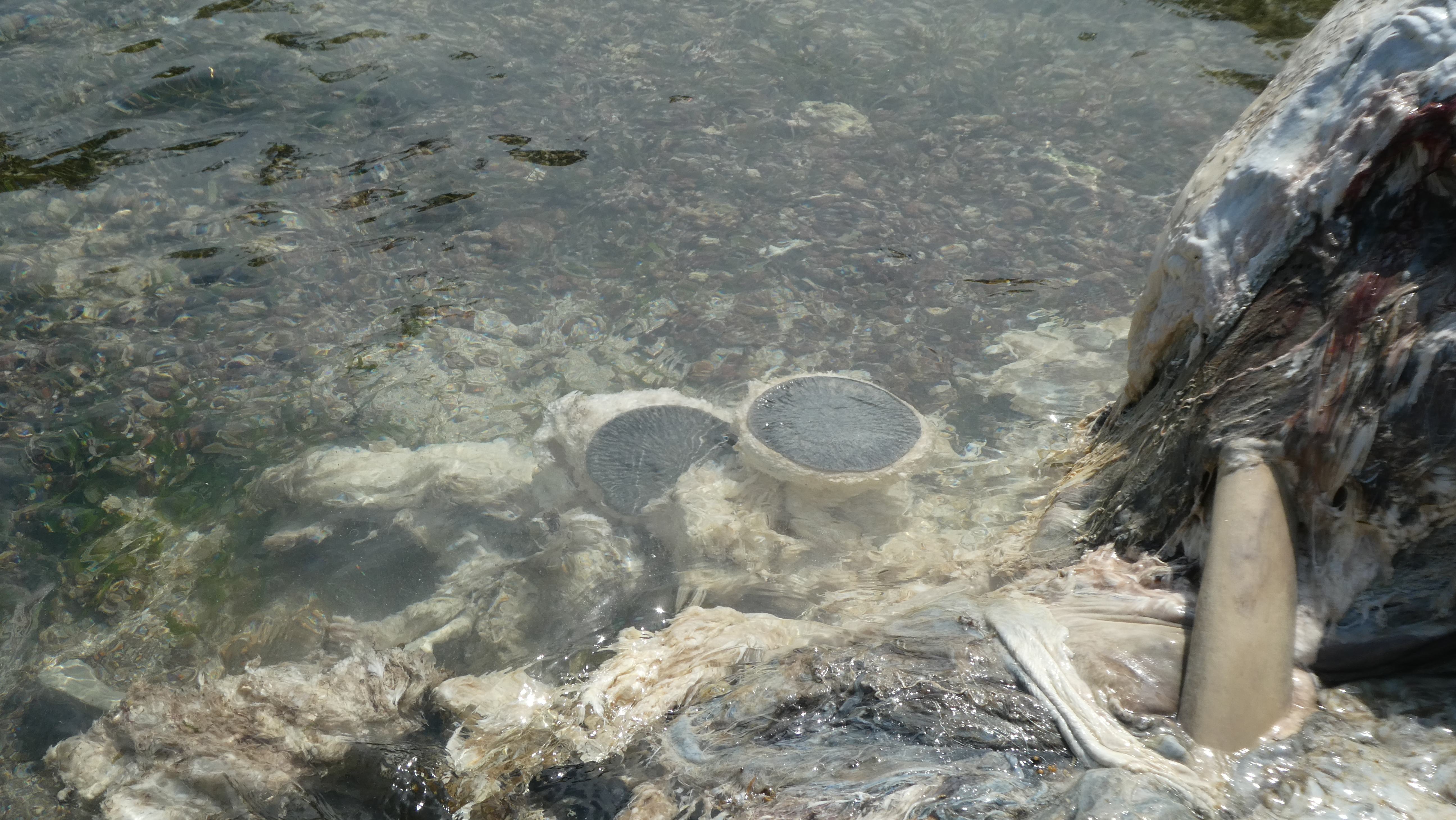 Etter en stund kom kapteinen tilbake, like barnslig oppjaget som gunaene. Det var hodet til en diger hval som var vasket i land. Vi hadde jo sett det på vår tur rundt øya men trodde det var en stor stein.Han hadde forsøkt å forklare at tennene er verdifulle. Det er jo elfenben. Kapteinen var villig til å betale for to tenner. Stor ståhei. Gunaene fant frem det de hadde av verktøy, som var gammelt og ganske ubrukelig. Derfor fikk de en av våre rustfrie kniver.Dette er nok de store øynene de pratet om. Som har poppet ut av hodet på den RÅTNE hvalen.Da Steinar sa at han ville ha 5 store tenner og ville betale US$ 40,- for dem ble det enda mer ståhei. De gikk løs på det stinkende kadaveret med stor arbeidsvilje og pågangsmot. De kan umulig å luktesansen i orden.Tim fra «Q4» ville også ha 5 tenner for US$ 40,-.Gunaene er faktisk verdens nest minste folkeslag. Bare slått av pygmeene.En forlatt guna kano. Eieren er mer interessert i å hogge ut tenner på hvalen.Vi jentene ville heller sitte og nyte den vakre stranden. Gutta fikk ordne med stinkende hval lik.Og kanskje snorkle litt. Det var dessverre ikke så mye å se.Denne kanoen er nok eid av en mer velstående guna. Alle kan sette på seil, men ikke så flott som dette.Herr og fru «Q4» koser seg i solen med en kald pils. Rettere sagt, i skyggen.Pelikanene fisker på revet.Tim sjekker om jobben går fremover. Vi kunne ikke se at gunaene hadde mobiltelefoner, men det må være grunnen til at nyheten spredde seg så fort. Etter hvert var det MANGE gunaer som hogget ut tenner. Jeg håper de får solgt til turistene som kommer seilende. Det er jo ikke slik at disse folka vasser i penger.Dette er fangsten vår. 5 hvaltenner for US$ 40,-. Hva vi skal med dem er jo en annen ting. Vi har ingen anelse. Dessuten er det forbudt å ta med seg noe fra maritime pattedyr inn i USA for eksempel. Selv om vi nå kan dokumentere at dyret var definitivt dødt før vi trakk ut tennene dens. Smilet til gunaene da de fikk betalingen sin på US$ 80,- gikk nesten rundt. De var jo bare 3 som skulle dele de pengene. Godt å kunne bidra litt til lokalsamfunnet.