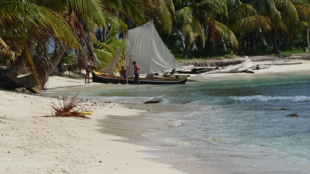 Etter en times tid hadde vi nådd målet for i dag. Esnasdup. Her måtte vi selvfølgelig også tråle oss mellom rev og andre uhumskheter.Vel, dette er ikke en uhumskhet, men en lokal fisker. Gunaene er kunnskapsrike sjøfolk. Det må de jo være. Her er det bare hav og palmeøyer.Her i Esnadup var det mange fra Gruppe 2 som var ankret opp. Veldig morsomt å se så mange av dem igjen. Her i San Blas seiler alle som de vil. Ingen restriksjoner. Og møtes vi, så møtes vi.Og så kom den andre norske båten vi har sett siden Aruba. Men, det viste seg å være samme båten. «Wapiti» fra Bergen. Det var de som hjalp oss med fortøyningene på Aruba før de forsvant som spøkelser.Helene og Andreas kom selvfølgelig om bord en liten tur og fikk en pils hver, og vi kunne prate norsk igjen. Milde måne så deilig. De skal gjennom Panamakanalen og over Stillehavet denne sesongen.