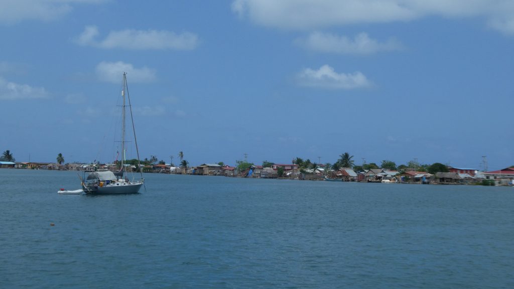 På vei vekk fra Tupbak fikk vi se kanopadling in action. De kan virkelig håndtere denne farkosten. Tror nok jeg hadde veltet umiddelbart.Gjennom denne kanalen må vi. Altså mellom disse to reva. Hele San Blas er smekkfull av rev, så derfor har vi spesialkart lastet ned fra Eric Bauhaus sin bok «The Panama Cruising Guide». Får håpe de stemmer, for karta på kartplotteren er heller unøyaktige.Terry på «Sisu» fortalte på VHF’en denne morgenen at det bare kom til å være 3-6 knop vind i dag. Han tok feil. Eller værmeldingen tok feil. VELDIG feil. Vi fikk opp mot 21 knop vind midt i fleisen og rotete sjø. Vi slet oss fremover i 3 knop. Men endelig dukket Ustupu opp.Og jeg er lei for å si det, men det er noe av det styggeste jeg har sett. Jeg ble ganske deprimert. Det var ikke dette San Blas skulle dreie seg om. Jeg hadde ikke noe behov for å være med inn i denne byen for å se på andre folks elendighet. Føler meg som en «Peeping Tom».Her får man et inntrykk av hvordan Ustupu Waterfront ser ut.